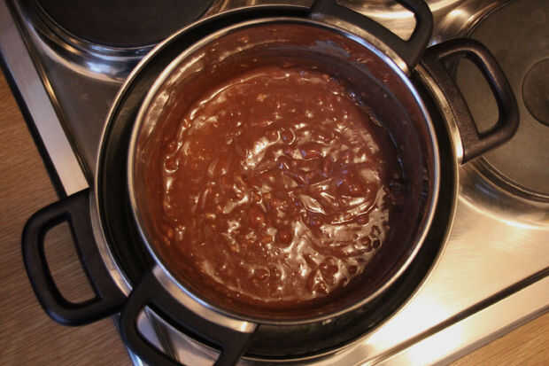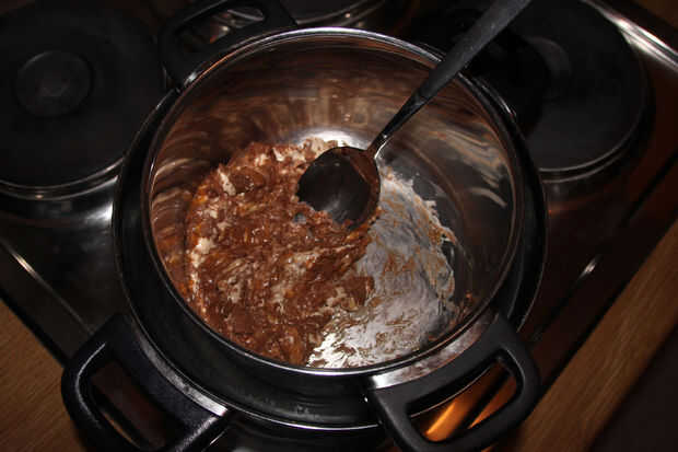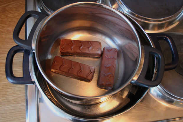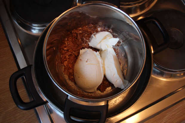 Preparar un baño de agua, para fundir el Snickers. Agregue una taza de queso Mascarpone y 1/2 taza de nata hasta conseguir una mezcla suave. Dependiendo de tu heladora hubiera podido enfriar la mezcla en la nevera antes de usarla. Así que asegúrese de seguir las instrucciones. Si tienes que enfriarlo en la nevera no olvide revolver de vez en cuando.