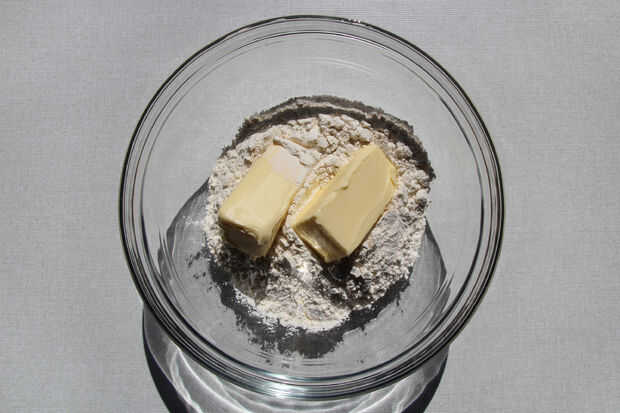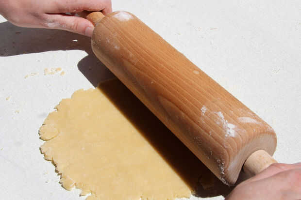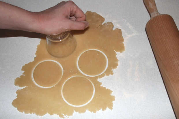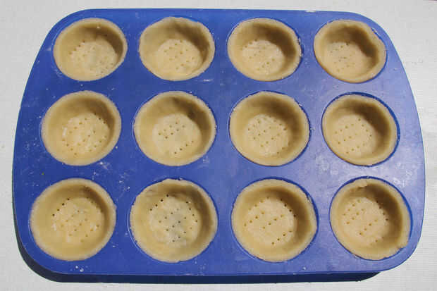 Rodar fuera la masa, hasta que tenga un grosor de unos 5 mm. no hacerlo demasiado fino o se romperá después. Coloque en la bandeja de muffins y use un tenedor para pellizcar, como se muestra en la imagen, para evitar burbujas de aire.