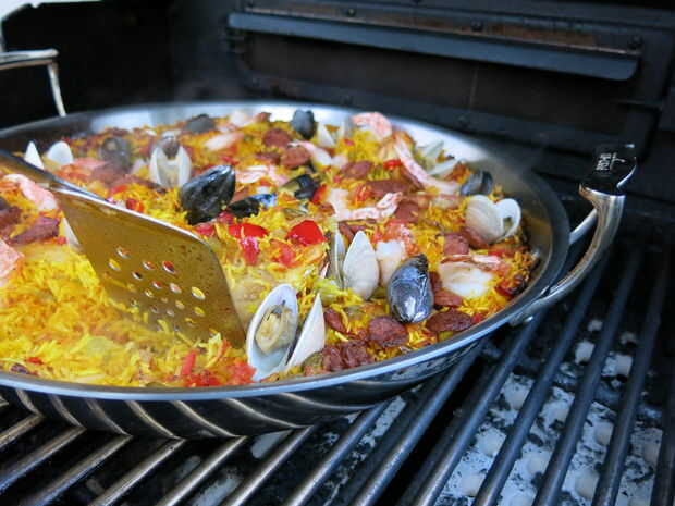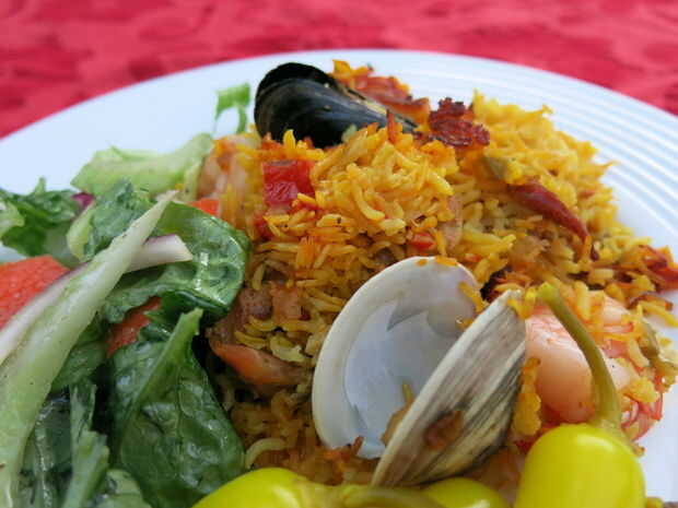 Paella es un plato de arroz empapado con azafrán, originario de Valencia, España. Incluyen los ingredientes tradicionales en la tradicional Paella Valenciana: pollo, conejo, frijoles, arroz, azafrán, pimentón, Romero, ajo, caracoles y aceite de oliva