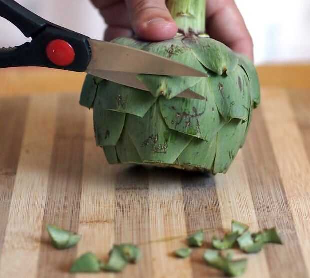 Clip de los filos de las hojas restantes. Esto hace la manipulación de las alcachofas después más fáciles y puede facilitar más superficie para cocinar al vapor.