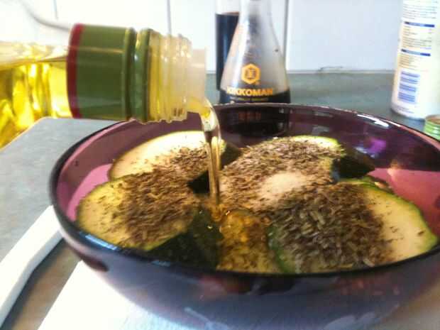 Cubrir todas las rebanadas en aceite (adobo) o agregue el adobo más a menudo. Ser suave con el calabacín. Si usted no quiere "perder" tanto aceite de oliva puede utilizar una mezcla de oliva y aceite vegetal genérico.