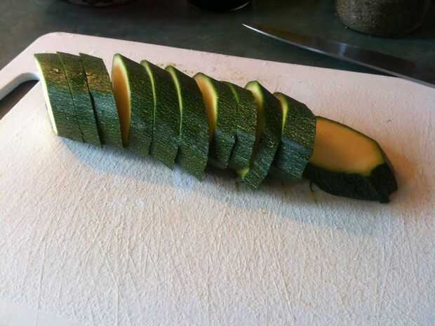 Después de eso, cortar el calabacín en rodajas gruesas de bonitos. Si usted corta en ángulo (se muestra en la imagen), sus sectores será más largos. Sectores más significa facilitar la manipulación durante la cocción. Busca aproximadamente 1 centímetro de espesor, de esta manera conoces que tus rodajas perfectamente hará a lo largo y bonito y caramelizada en la parte exterior sin quemarse.