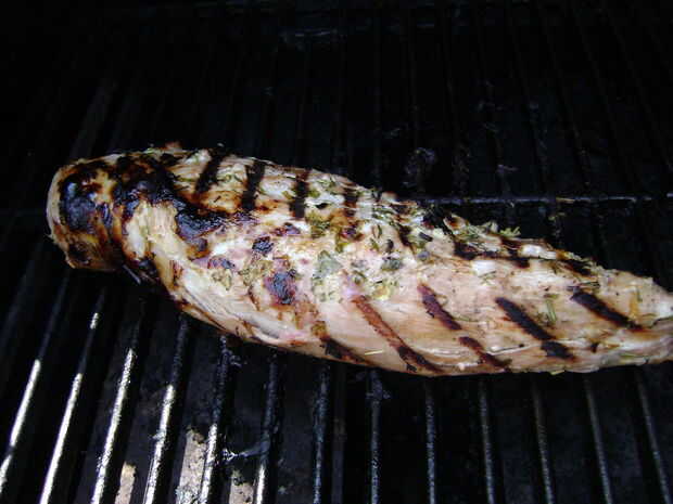 esto es una gran entrada que es muy fácil de hacer. El solomillo es "filete tenía" como un pez y luego una mezcla de tapenade (aceitunas machacadas y aceite de oliva) se extiende sobre el lomo y es enrollada, cubierto de tocino y a la parrilla.