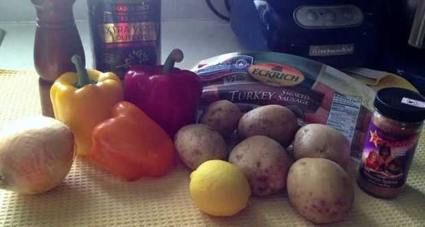 1 paquete (14 oz) smoked salchicha de pavo o kielbasa, rebanado en 1/2 pulgada espesor rondas
