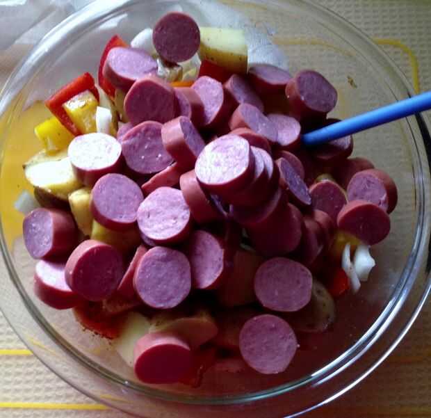 Cubrir las patatas con el abrigo plástico, horno a microondas a alta 4-7 minutos, sacudiendo cubiertos recipiente hasta la mitad de la cocción, hasta que los bordes de las patatas aspecto translúcidos. Quitar la envoltura de plástico y papas de drenaje. Añadir los pimientos, cebollas, salchicha, jugo de limón, aceite, sazonador y sal al cuenco, mezclar bien.
