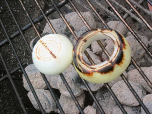 Esperar buena 4 minutos o así, luego voltee la cebolla quitando las capas exteriores de 2-3 separando cada cebolla en 2 partes. Tapar y esperar 2-3 minutos y luego tirar la cebolla la parrilla.