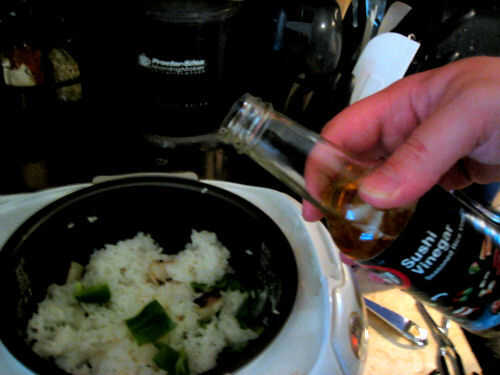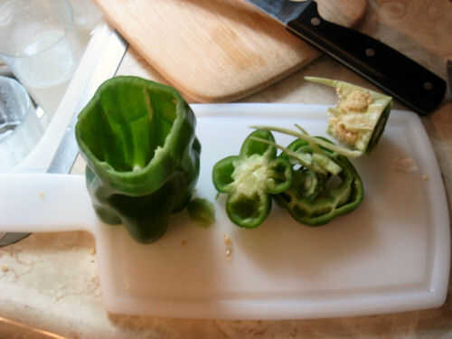 Resto de la preparación se hace en las verduras cortar tablero por lo que su carne puede ir en este momento en el fregadero. Cortar ambos extremos de la pimienta verde y su cuchillo por dentro para sacar todas las semillas. Dale un enjuague rápido bajo el agua y picar en trozos pequeños. Corte la cebolla a la plancha aproximadamente el mismo tamaño que el pimiento. La cebolla debe descansar mientras su repartido con la pimienta. Mi arroz fue hecho en este punto tal, en las verduras fueron. Mezclar algunos sushi vinagre en el arroz para condimentar un poco más. Si el arroz queda un poco de tiempo para ir, configuro todo en un recipiente y esperar. Aún hay más que hacer.