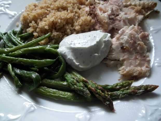 Pares de Pompano a la brasa con mis recetas de Yogurt de menta y quinua en cocina con sólidos del jugo.