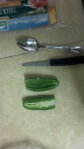 Corte cada uno de los jalapeños maneras de longitud a la mitad y use una cuchara para sacar las semillas y las venas de las paredes del jalapeño.