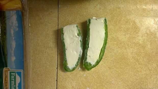 Tomar un cuchillo y extender la crema de queso, nivel con las paredes, en el área limpia de la mitad del jalapeño.