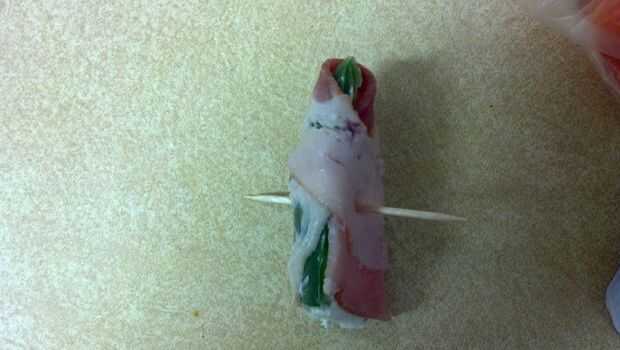 Cortar el tocino a la mitad y envolver cada trozo de bondad encantadora alrededor de los jalapeños rellenos y asegure con un palillo de dientes.
