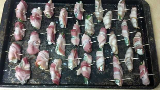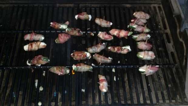 Cocinar en la parrilla tienes que verlos de cerca para no quemarlos cuando cae la grasa del tocino en el protector de la grasa. I encender mi quemadores alto y cocinar entre los protectores de grasa y darles la vuelta de vez en cuando para mantenerlas de la quema en cualquier lado. Tarda unos 15 minutos para los jalapeños para suavizar y el tocino a crujiente.
