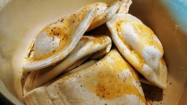 Mezcle el pierogi en aceite de oliva (infusión de ajo funciona muy bien). Que sumergirlo durante unos 20 minutos mientras descongela. Cortar la cebolla y picar el cebollino.
