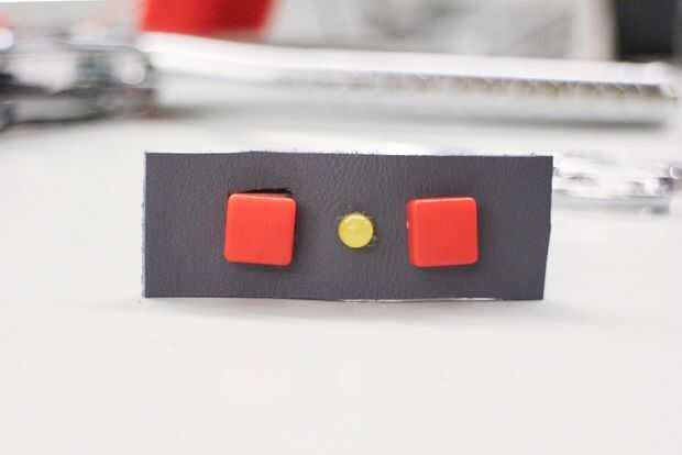 Cortar un trozo rectangular de cuero gris para caber al lado el dobladillo en el frente de centro consolidado. Hacer un agujero en el centro para el LED y las aberturas de un poco más pequeñas que las tapas de interruptor. Impulsar los componentes y pegar en la piel de la parte posterior.