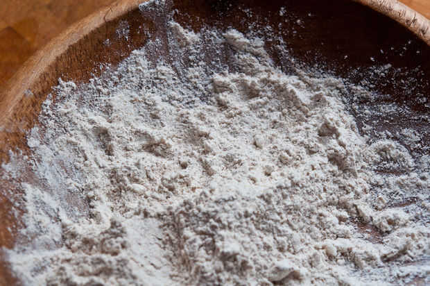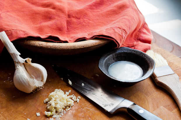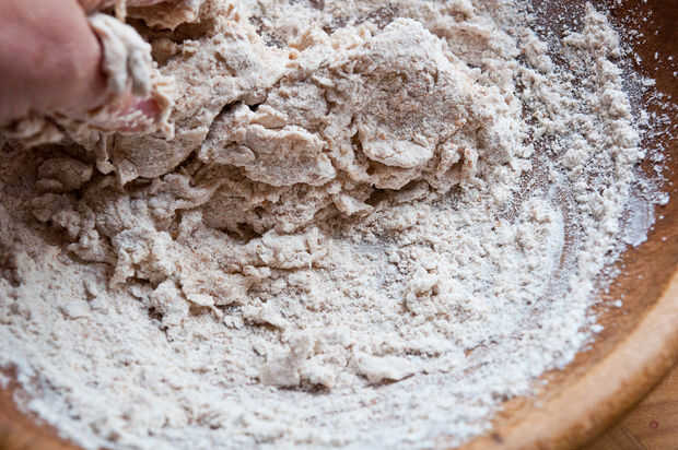 Combinar la harina, el polvo de hornear y la sal en un recipiente poco profundo. Añadir 1 cucharada de aceite de coco y "smoosh" la grasa entre los dedos, incorporándola a la harina, hasta que los grumos de grasa del tamaño de un guisante pequeño. Gradualmente agregue el agua, removiendo con los dedos hasta que la masa salga juntos. Amasar un minuto o dos. Cubra con una toalla mientras picar el ajo y derretir el resto del aceite de coco. (20 segundos en el microondas)