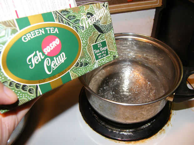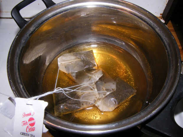 Mientras tanto, poner agua a hervir y apagar el fuego. Añadir en las bolsas de té, dejar empapar por 5 minutos, desechar