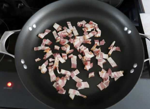 Cocine el tocino en una sartén de 10 pulgadas a fuego medio hasta crujiente, 8 a 10 minutos. Use una cuchara ranurada para transferir tocino a placa forrada de toalla de papel, reservando la grasa de tocino en la sartén.