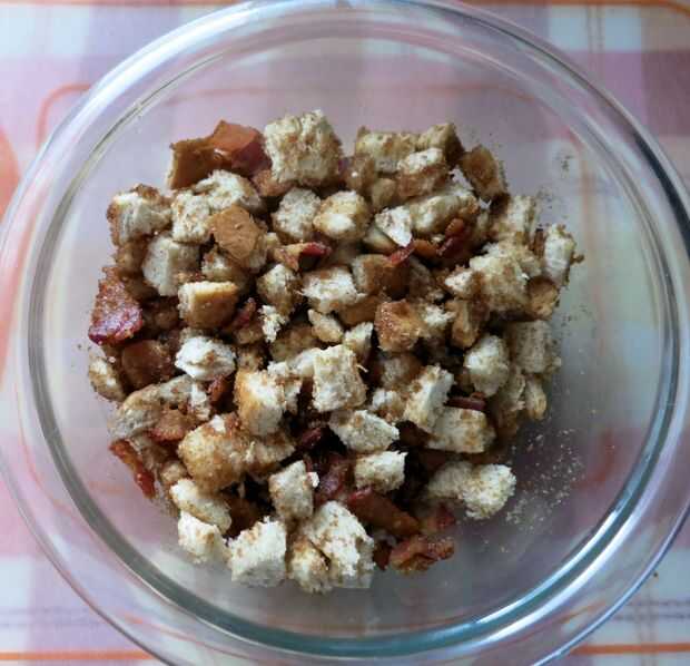 En un tazón mediano, mezclar el azúcar morena, 1/4 de cucharadita de canela, pimienta de Cayena, 1/8 cucharadita cada uno sal y pimienta, hasta combinar. Añadir en la llovizna tomillo, pedazos de pan y tocino cocido, con 2 cucharadas de grasa de tocino reservado y sorteo para combinar. Ponga a un lado.