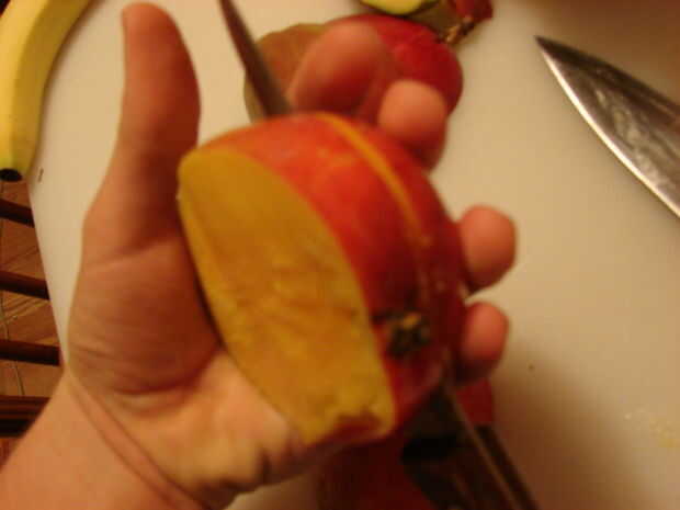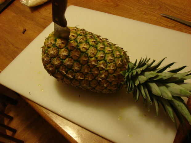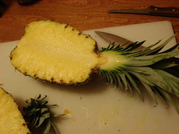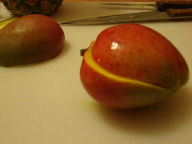 Lave todas las frutas, como piña. Todos la mitad de la fruta no hoyo, a lo largo. Cortar un poco a la derecha (o izquierda) del centro en el mango, cortando la carne desde el foso (ver imagen). Cortar la piña en la mitad, una parte más grande que el otro, dejando la corona y cortando también. La mitad de grande es lo que podrá sacar y poner la fruta en.