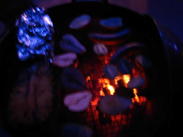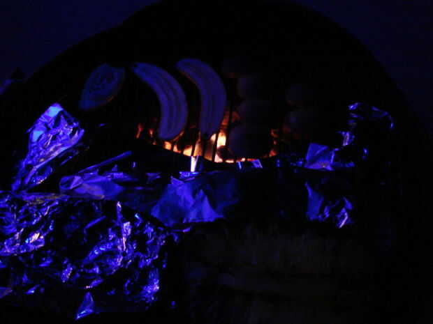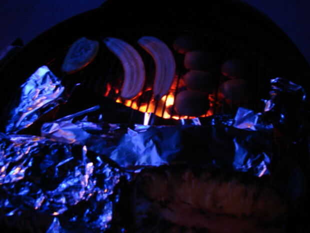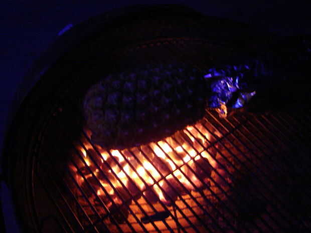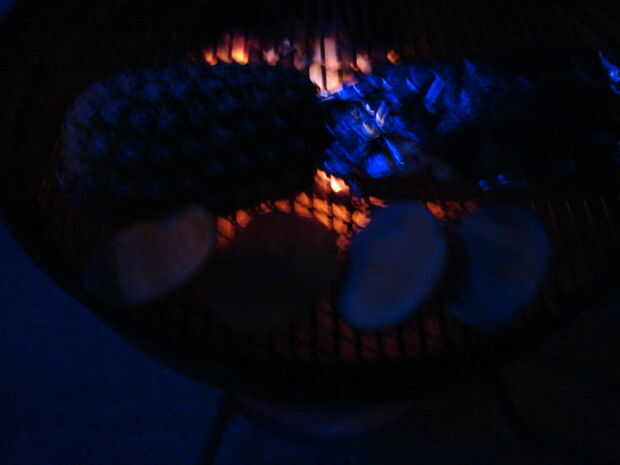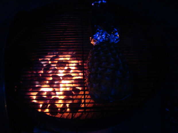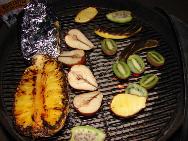 Empezar por cocinar la piña en la zona caliente. Que desea bloquear en sabor y humedad charing ligeramente cortar del lado de abajo. Mueven enfriar la zona. Coloque el resto de la fruta en la zona caliente. Cocinan muy rápidamente para bloquear en el sabor, pero no char, hacia la zona fría. Cubrir y dejar cocinar diez minutos. Destapar, quitar cualquier fruta hecho (probablemente el plátano), voltee la fruta (ahora su piel hacia abajo). Cubierta deje cocer otros diez minutos. Todo se debe hacer en su siguiente cheque. Retire de la parrilla, raspe cualquier carbonización.
