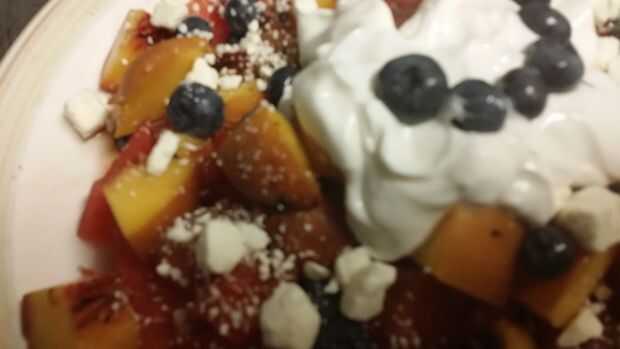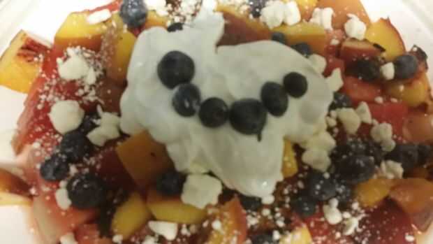 Esta ensalada a la parrilla había incorporado sandía a la plancha y fresco. Los melocotones fueron a la parrilla para mejorar el sabor y aroma. Luego se remata con arándanos, queso feta con una porción de yogur endulzado y aromatizado con vainilla extracto.