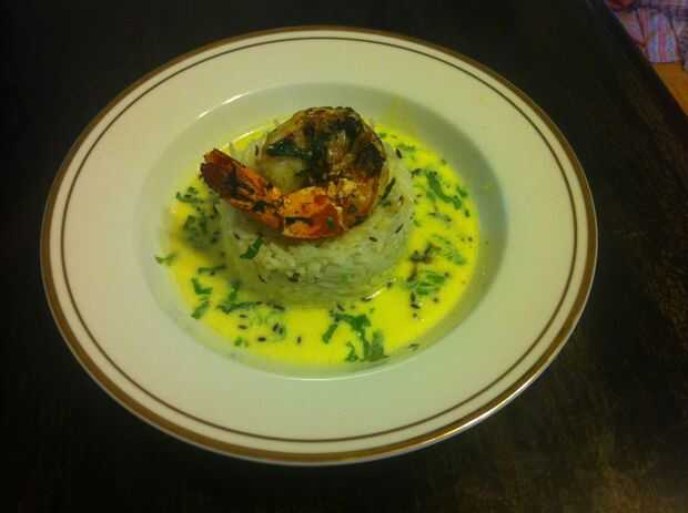 A la plancha langostinos con Chutney de coco Yogurt, comino arroz y ensalada de col rizada
