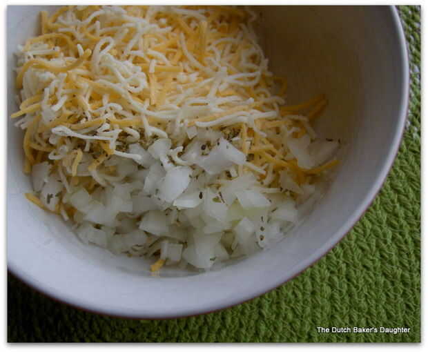 En un tamaño mediano cuenco, mezclar el queso crema, cebolla, queso rallado y condimentos. Ponga a un lado.