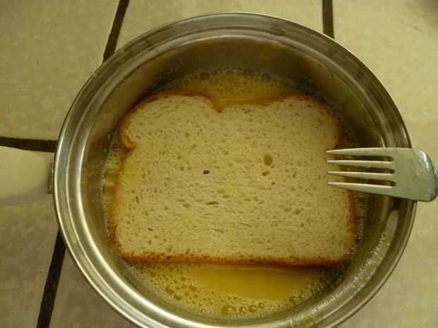Remoje el pan en huevo mezcla flip para que ambos lados están cubiertos.