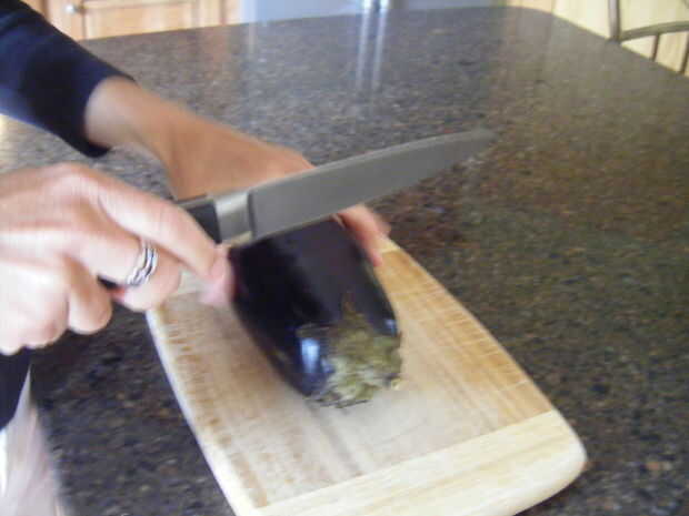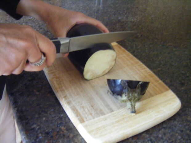Corte la berenjena en trozos 1/2 pulgada de espesor.