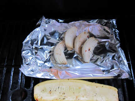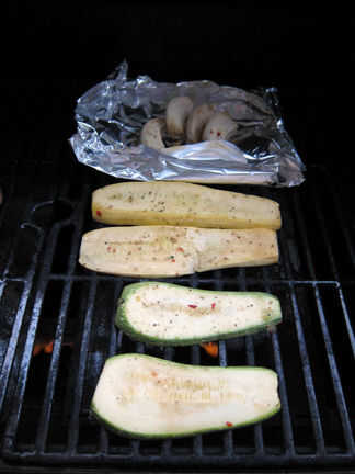 Los pedazos más grandes, los pimientos, la calabaza y el calabacín puede ir a la derecha en la parrilla. Los pedazos más pequeños, las cebollas y los champiñones van en una bandeja de papel pequeña hecha de un pedazo de papel de aluminio.