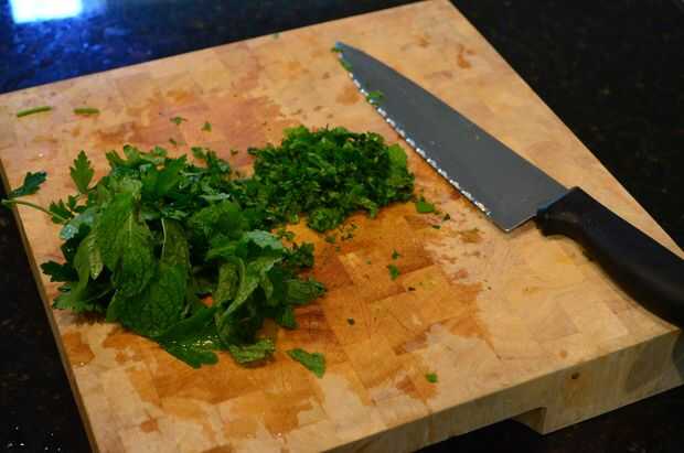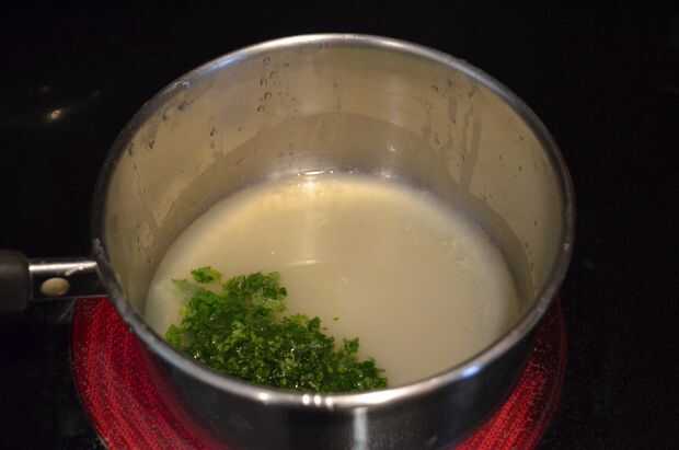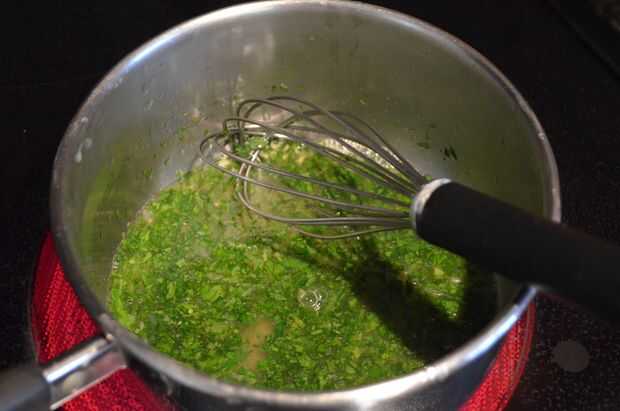 • Calentar el jugo de limón, azúcar y 1/2 de las hierbas finamente picadas en una olla pequeña.