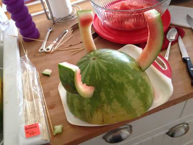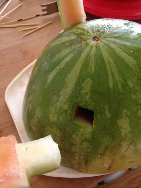 Hice esto hace unos años y han hecho unos cuantos diferentes desde, pediría a los niños qué animal les gustaría para los cumpleaños allí y esculpir utilizando principalmente sandías y otras frutas donde en temporada. Desde que hice este hace rato no