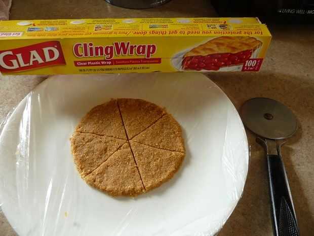 Línea un plato con una envoltura transparente, luego poner unos 3/4 de taza de corteza sobre la placa. Presione la corteza en una parte plana forma de galleta redonda. Cortar con un cortador de pizza y ponerlo en el congelador. Repita este proceso hasta que haya la mezcla restante de la corteza.