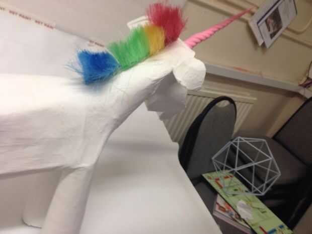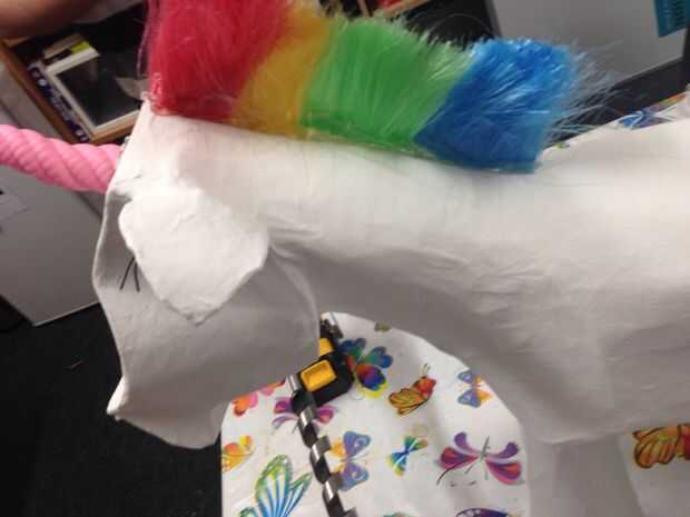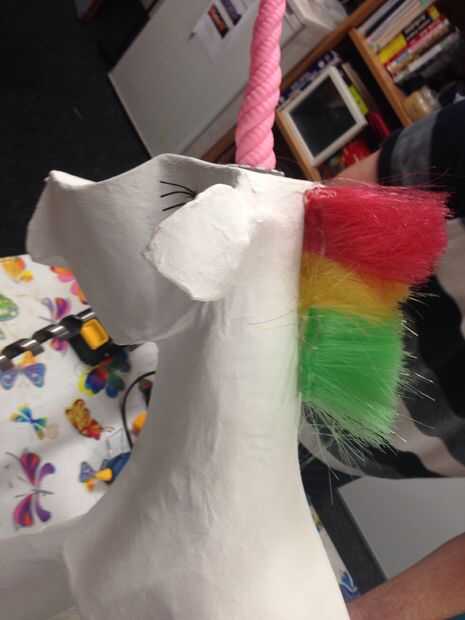 Crear una melena de arco iris era más fácil decirlo que hacerlo. Barajamos la idea de uso de hilo pero luego inspiración golpeó un día mientras estábamos teniendo un makerspace sesión de limpieza. El material de melena perfecta estaba escondido a simple vista! Todo lo que necesitábamos era parte de nuestra ' plumero '. Aunque algunos de los niños hubiera preferido que nos carnicero nuestro plumero existente (seamos honestos, que sería algo limpio que hacer) los adultos prevalecieron, y compró un paño nuevo y limpio para utilizar para la melena.
