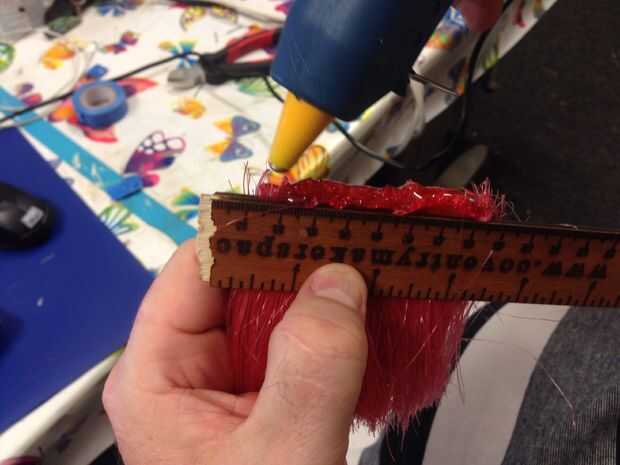 Nos habían cortado los pelos del duster en cada uno de los colores que necesitamos. Entonces organizamos en las secciones delgadas, entre dos reglas y agrega pegamento caliente liberalmente al final. Luego pegado en su lugar en el Unicornio y procedió con la siguiente sección.