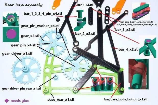Mismo otra vez con la parte trasera base parte base_rear_x1.stl pero también añadido ahora es A.M.E.E.s soporte bar_base_body_bottom_x1.stl al final. Por favor, compruebe las piezas fundidas especialmente donde el apoyo de Sólo tres puntosdel pegamento! El bar_4_x2.stl es cerca de la bancada trasera hay una distancia entre la barra de soporte del cuerpo. Compruebe la imagen de la parte inferior izquierda representa - tiene que ver de la misma manera