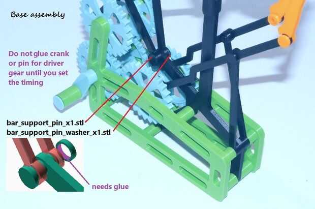 El bar_support_pin_x1.stl y el bar_support_pin_washer_x1.stl conecta los extremos abiertos de bar_2_x2.stl con la parte de bar_base_body_bottom_x1.stl . Esto tiene que pegar otra vez y el bar_2_x2.stl tiene que ser movible luego.