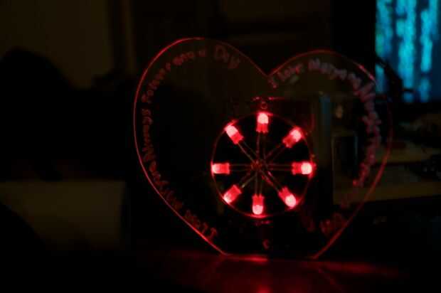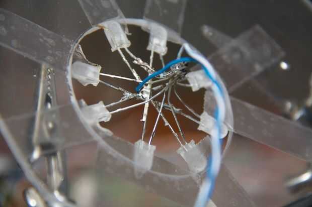 Luego usé el orificio del había en el corazón más grande y poco de cinta para crear una plantilla de tipo. Primero soldar LEDs a la vez juntos por las piernas (menos) negativas y había doblado las patas positivas (ya) para arriba en sobre 45 º. Grabó 4 pares de LEDs en ángulos de 45 grados igual unos de otros y luego soldar las patas negativas ahora tocando juntos. Entonces inclinó los cables positivo por lo que estaban tocando. Tomé algunos cable red cat5 para un plomo. La negativa (azul) está conectada con todos los LEDs negativo. El cable positivo es envuelto alrededor de los cables positivos juntos les vinculantes y soldado.