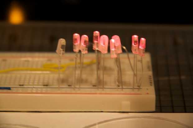 Tomé mi amoladora de prestado y mi LED de tierra plana de dos lados como se aprecia en esta foto hasta que fueran del mismo grosor que el plexiglás. Simplemente mantenga un LED por las piernas y aplicar ligera presión contra la molienda se realiza rueda y en ningún momento. Recuerde que ir lento. Los LEDs son realmente sólo un diodo que está cubierto de una lente de plástico duro. Puede moler o arena para darle a los LEDs una mirada difusa. En este caso los lados son difundidos pero la punta todavía tiene la calidad de la lente y produce un intenso haz de luz roja pura. (los LEDs en esta foto son los antiguos... los LEDs agradables no llegó desde Hong Kong hasta el día antes de día de San Valentín! Reconstruido con ellos cuando llegaron)