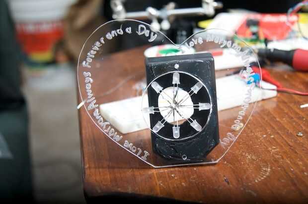 Tomé una caja de pequeño proyecto y recortar las esquinas para adaptarse a la forma del corazón para que no se muestran en la parte inferior. Usé pegamento caliente para fijar el corazón más grande. Nota que os adjunto la parte inferior de la caja al corazón para que más adelante podría tener acceso a los tornillos que sujetan la tapa en la parte posterior. Después de instalar corté un agujero poco a poco hasta el conjunto de LED que soldó juntos caben en agradable y al ras. Luego usé una pequeña gota de pegamento caliente al lado de cada led para mantenerlo en su lugar.