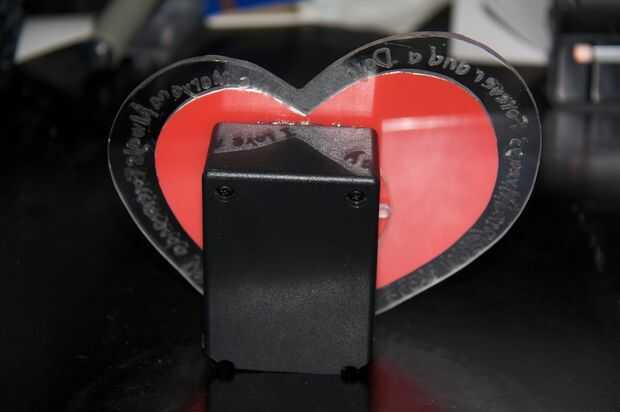 Después de algunas pruebas y metiendo los cables en su lugar debe ser terminado cerca. No se muestra en las fotos, son el lado opuesto de los tornillos utilizados para unir todo. Pasan por ambas piezas de plexiglás y el cuadro de proyecto. Interior cada tiene una tuerca pequeña mantiene todo juntos. En la parte posterior se pueden ver la proyección portátil de plástico rojo y el lado más sucio del grabado. En el lado puede ver el micro interruptor se presiona. Los LEDs parecen grandes en persona durante el día y sorprendente por la noche. Debido al sencillo diseño del circuito y genialidad de los 555 IC este circuito debe funcionar con una batería de 9v hasta que está completamente muerto puesto que no utiliza regulador de voltaje. Simplemente desenroscar dos tornillos en la parte posterior permite un intercambio rápido de la batería si es necesario. Espero que todos disfrutan de este instructable, sé mi Valentín hizo.