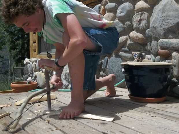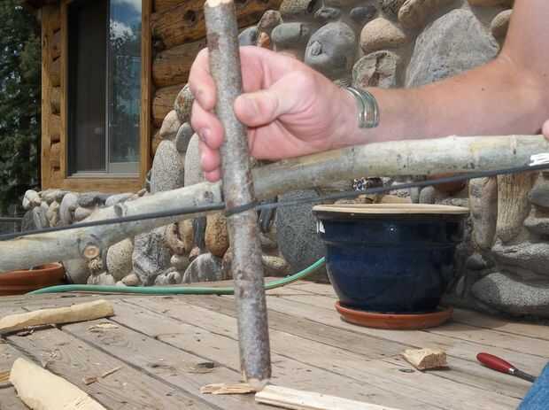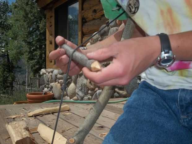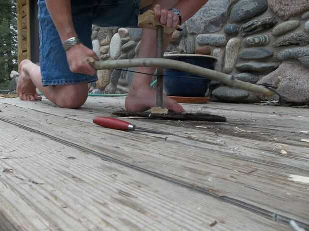 En este paso, se taladra los agujeros en el mango y el fireboard para que el eje no se deslizará hacia fuera. Comience poniendo el pie izquierdo a la izquierda de la muesca labrada en el fireboard. Colocar la rodilla derecha una cómoda distancia detrás de su pie izquierdo. Ahora gire el husillo de esta manera: Sostenga el arco debajo de su brazo derecho, cubrió contra su costado, para que ambas manos están libres. El espesor final debe ser el fijado bajo el brazo, y la cadena debe ser en la parte superior, sobre el arco. Poner el eje para que la parte inferior final, que es más redondeado y estará en el fireboard, está a la derecha. Asegúrese de que la cadena está descansando en el centro del huso. Ahora invierta sus manos de modo que estás agarrando la izquierda del eje con la mano derecha y la derecha con la izquierda. Gire el eje hacia la derecha, tirando hacia arriba un poco, para que la cadena se retuerce con él. Se puede liberar el arco con su brazo, mientras el eje permanece en su lugar. Así, para comprobar: el eje está torcido en la cuerda, en el exterior. Debe ser hacia arriba y hacia abajo en la ranura de la fireboard, y la parte de madera del arco está a la derecha del eje. Poner el mango en la parte superior del husillo, la muesca en la punta y sostenga con su mano izquierda. Asegúrese de que calmar su muñeca en su espinilla izquierda. Sujete el extremo del arco con su mano derecha y comienza a perforar lentamente, moviendo el arco hacia usted y luego lejos de usted. No te preocupes acerca de velocidad ahora mismo, a trabajar en conseguir el movimiento hacia abajo. Empuje hacia abajo con su mano izquierda, no muy fuerte, pero solo duro lo suficiente para que no salte el eje. Si lo hace, tallar las ranuras más profundas en el fireboard y el asidero. Ahora comienzan a perforar más rápido y empujar hacia abajo con más fuerza, recordar usar la cuerda entera y para mantener la inclinación del brazo derecho. Que va, hasta que vea el humo y aun así seguir hasta que no se puede.