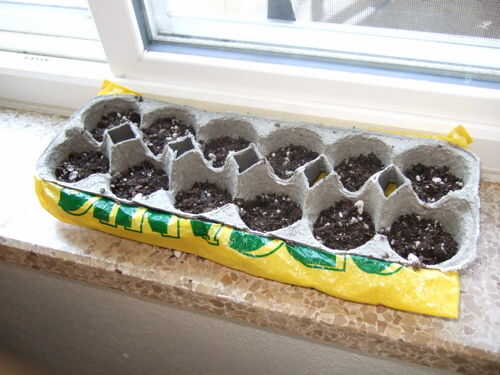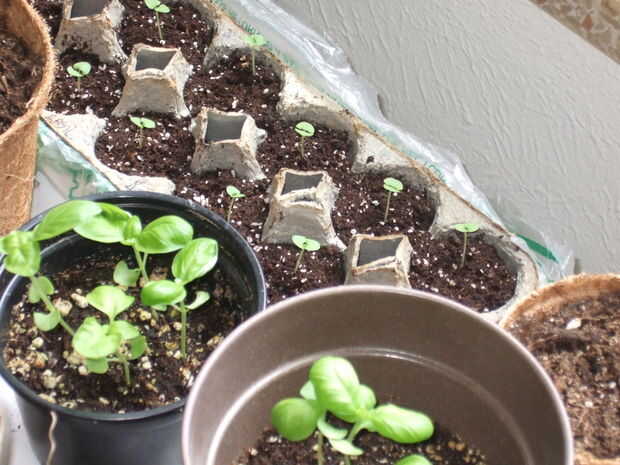La segunda foto muestra de albahaca en macetas y en un cartón de huevos. La albahaca en maceta fue plantada en las macetas y es por lo menos un mes más de los brotes. Voy a mantener en el interior en las macetas. Pero también quiero albahaca para plantar en mi jardín, y es por ello que he plantado más en el cartón de huevo - para tener un montón de brotes para poner en el suelo con mis tomates. Tenía albahaca - notoriamente fácil de crecer, brotar al 100% en el cartón de huevo. También tengo pimientos brotando bien, pero en mi tercera caja, con una mezcla de berenjena y dulce pimiento italiano, tengo cerca de 30% casos. También sospecho que el tamaño del huevo cavidades límite el crecimiento de mis plantas.
