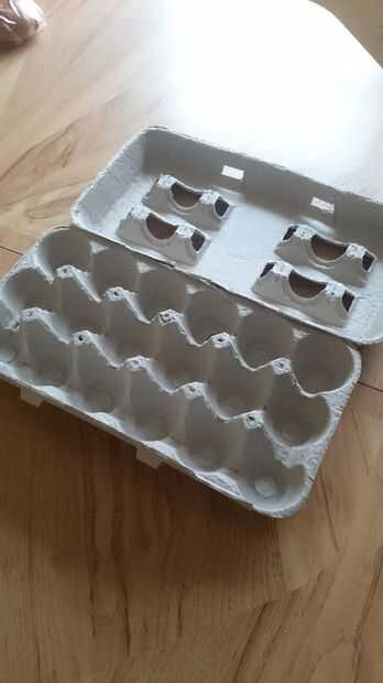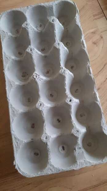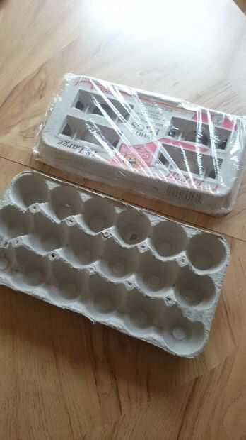 Para empezar, tome un cartón de huevos vacío y cortar por la mitad como se muestra. Con envoltura de plástico, cubrir la parte superior de la caja de cartón de huevo. Para mantener la envoltura de plástico en su lugar, puede utilizar cuatro pequeños trozos de cinta, grapas, etc.. La envoltura de plástico es útil para mantener el calor y la humedad de las semillas y plántulas.
