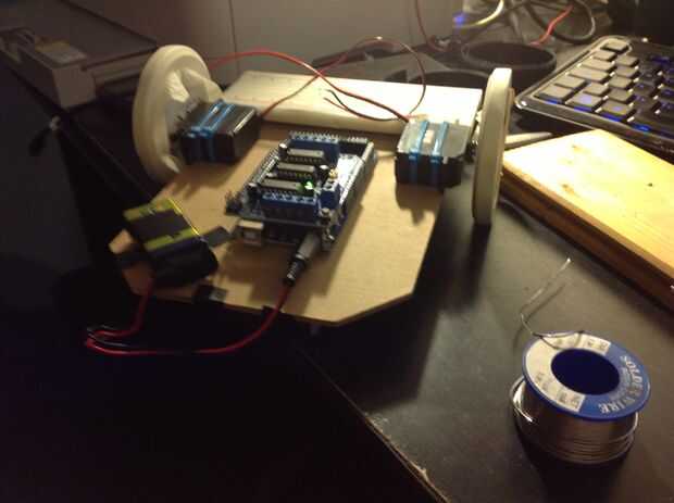 Actualmente estamos utilizando batería de 9V. Primero tenemos que soldar en el conector al cable de la batería. Cuando llegó el momento de montar la batería en la placa base nos dimos cuenta, que hay tan poco espacio. Así en la parte posterior de la base es un poco desequilibrada ya que la batería se monta en un lado y en otro lado no hay ningún peso.