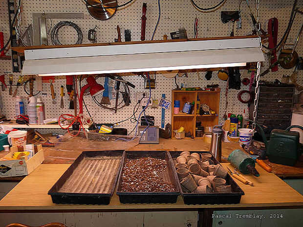 tengo una casa muy pequeña y necesito poner las semillas.  Tengo una mesa de ping-pong plegable en el sótano y el pondría el espacio adicional por debajo de ella buen uso del pensamiento.  Puesto que los lados se pliegan, sabía que acceso sería fácil