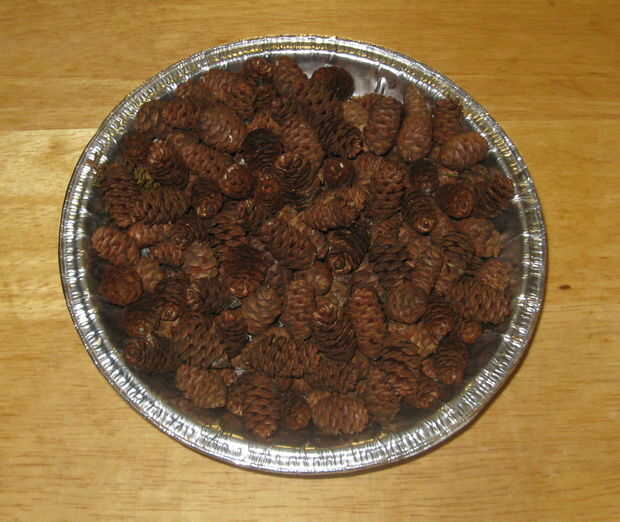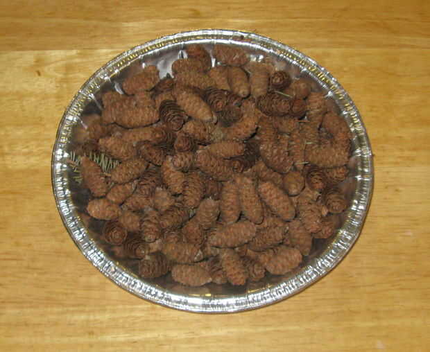 Colocar los conos en un plato y cocer en el horno a 350⁰, se abrirá los conos por lo que sólo puede tocar los conos duros hacer que las semillas caigan.
