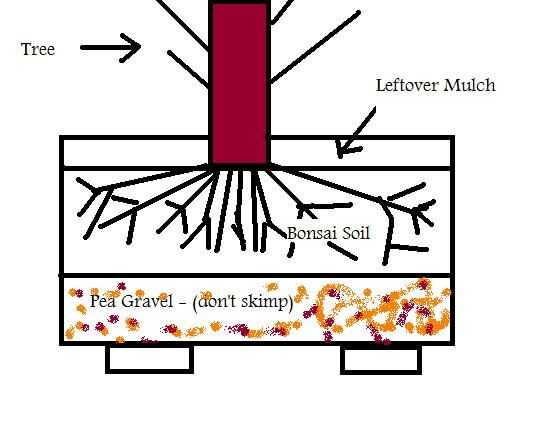 Tomé un poco de la suciedad mulchy del original olla y ponerlo sobre la parte superior. Creo que esto ayudará a mantener el suelo bonsai húmedo pero no empapado. Mantuve el pajote de la base del árbol sí mismo. (este paso abierto para el debate)