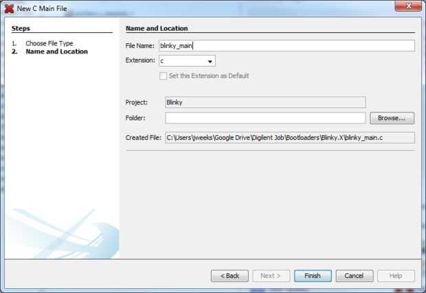Este paso es auto explicativa, pero querrá dejar vacío el campo "carpeta". De esa manera MPLAB colocará automáticamente su nuevo proyecto en la carpeta del proyecto que ya se ha creado.