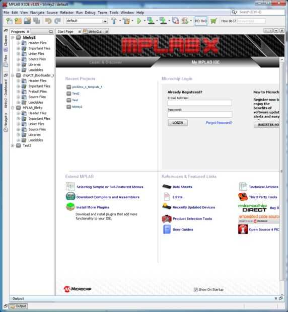 Cuando primero abres MPLAB, verá algo similar a la primera foto de arriba. Obviamente, no tendrás ningún proyecto abierto todavía, como hago en el panel a la izquierda.